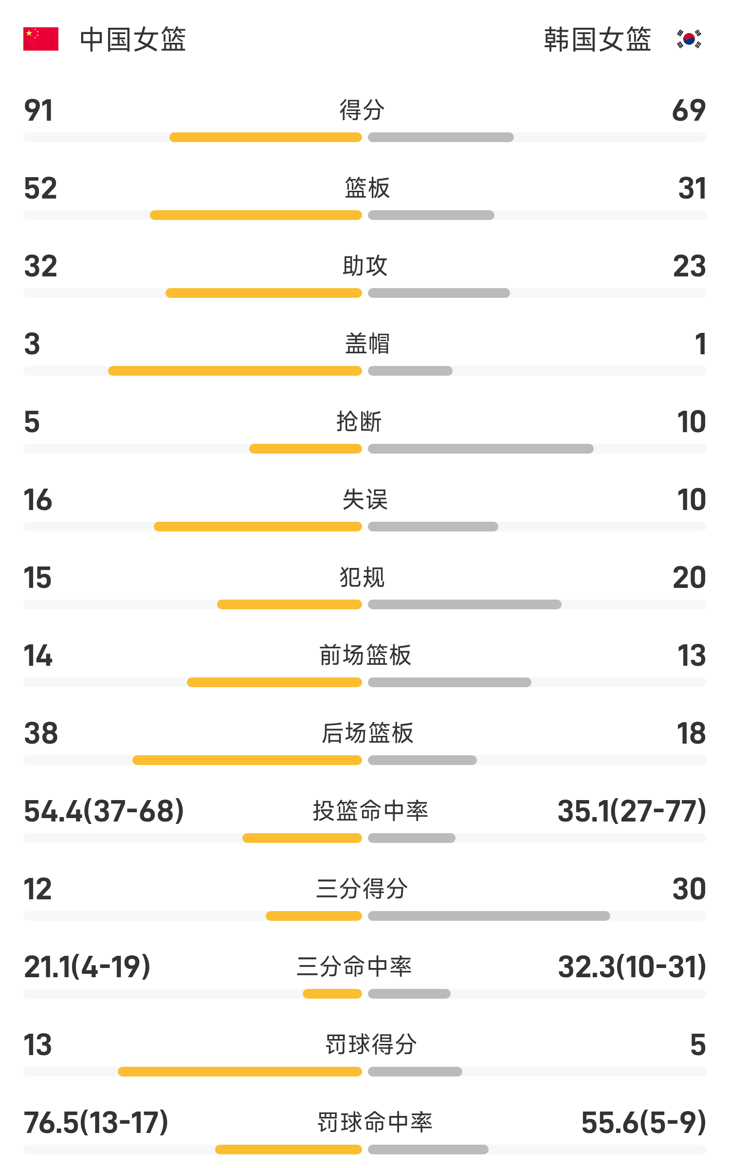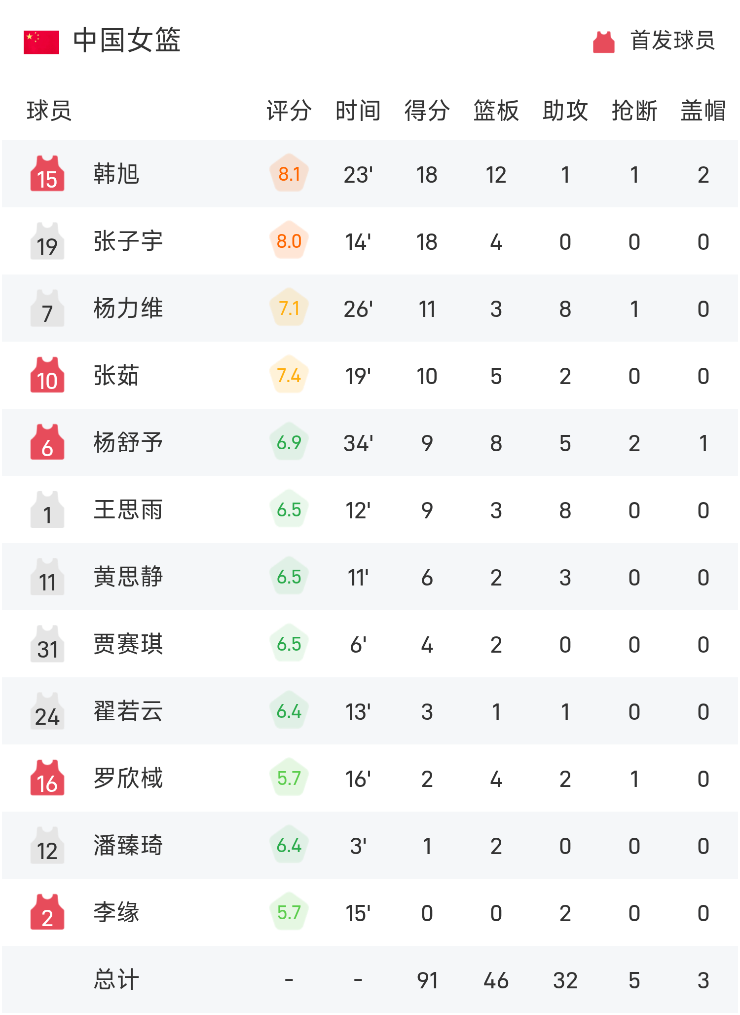 女篮亚洲杯战报:韩旭18分12板,张子宇18分,中国女篮91-69大胜韩国女篮